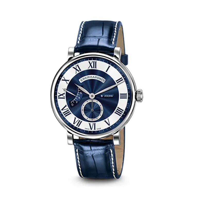 Reloj Eberhard & Co. 8 Jours Grande Taille Mecanico Manual: Un reloj 41 mm. Con esfera blanca y azul. Elegante y sofisficado reloj masculino con brazalete de cuero que decora la muñeca del hombre.