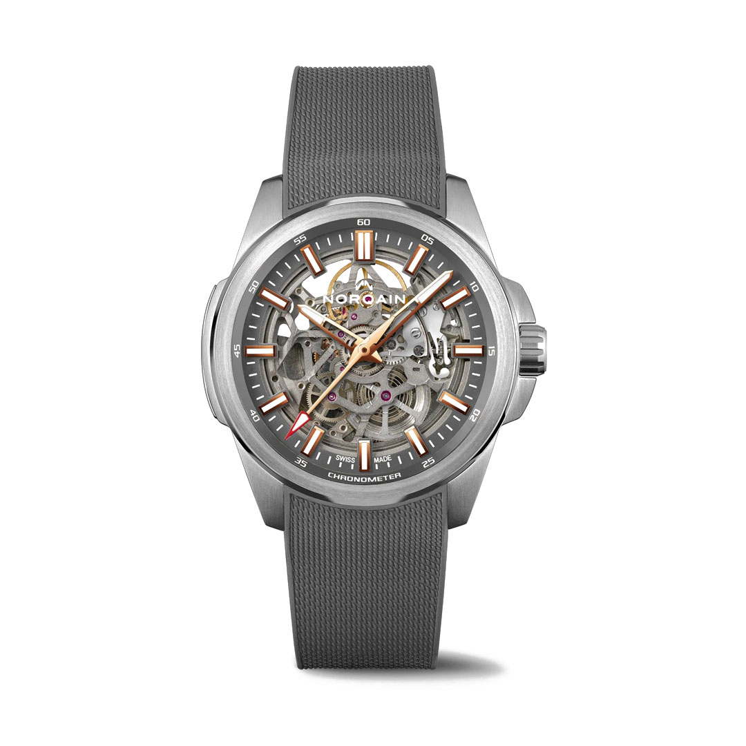 Reloj Independence Skeleton 42 mm Grey: Un guardatiempo de 42 mm. Creado en oro gris, con esfera skeleton y brazalete de rubbers color gris.
