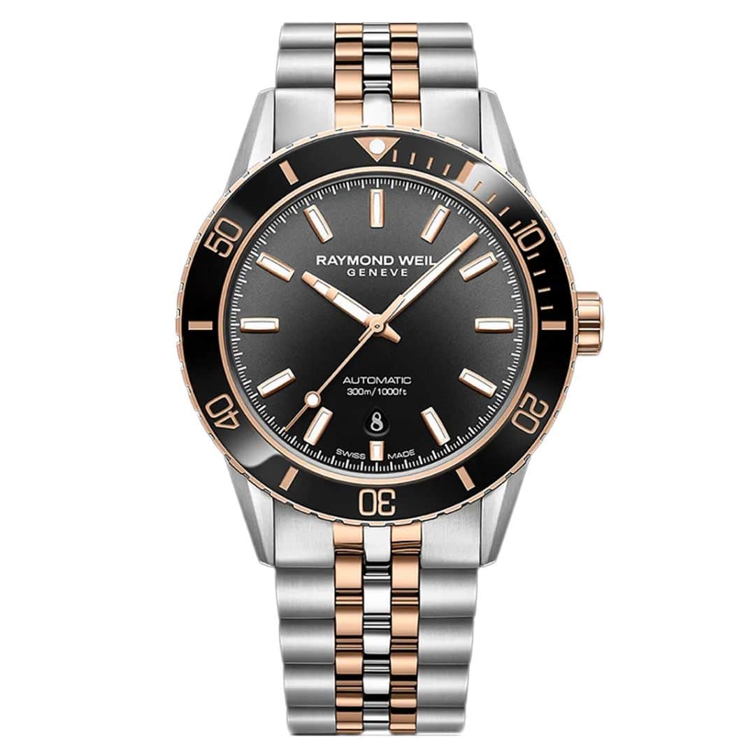 Reloj Freelancer Cronógrafo Automático Raymond Weil: 42 mm de caja. Un guardatiempo de acero con brazalete de acero con oro amarillo.