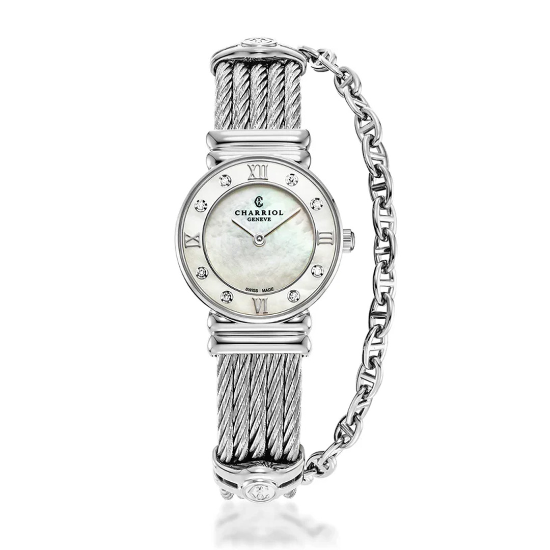 Reloj Charriol ST Tropez: Este delicado reloj Charriol es el complemento perfecto para medir el tiempo de mamá. Un modelo 20 mm de caja, movimiento de cuarzo y esfera luminosa de madreperla. El guardatiempo creado en acero y titanio es una pieza de lujo que forma parte de la línea más emblemática de la marca suiza.