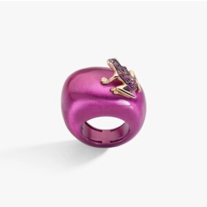 Pendientes y anillo Dada Arrogini: Asimétricos y con un algo inesperado: el colgante, para una mamá que valora el diseño distintivo y contemporáneo. Los pendientes Harry Frog presentan cataforesis fucsia, oro rosa, rodio y rubíes, y en compañía del anillo, hacen la dupla perfecta.