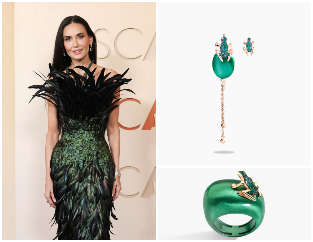 Demi Moore y Dada Arrigoni: El maximalismo de este vestido con plumas de Gucci hace buena dupla con pendientes y anillo de la marca Dada Arrigoni creados en oro rosa, cataforesi verde y rodio negro esmeralda.