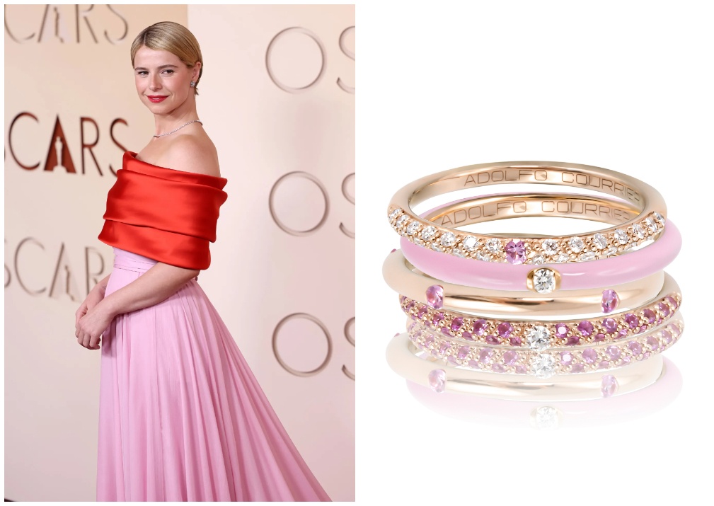 Jessie Buckley y Chanel: A este vestido bicolor (rosa y rojo) de Chanel añadimos piezas de Braganza que hacen juego: set de anillos de la marca Adolfo Courrier en oro rosa.
