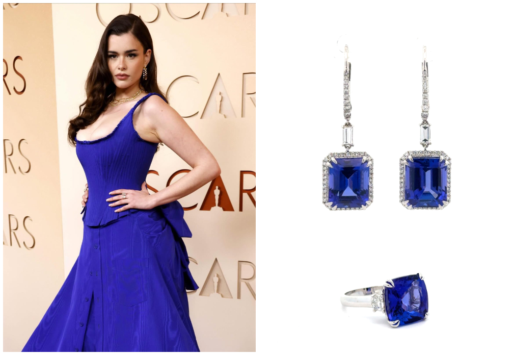 Barbie Ferreira y Braganza Jewels: A su espectacular vestido azul cobalto de Gap Studio en colaboración con Zac Posen, colocamos joyas a juego: pendientes elegantes con zafiros azules de Braganza Jewels para cerrar el look.
