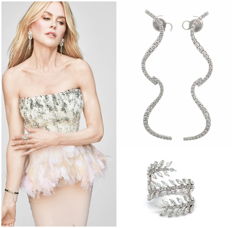 Nicole Kidman y Braganza Jewels: A las texturas, las plumas y los bordados presentes en este vestido Chanel, le añadimos joyas de la línea Braganza Jewels: pendientes y anillo creados en oro blanco de 18K y diamantes.
