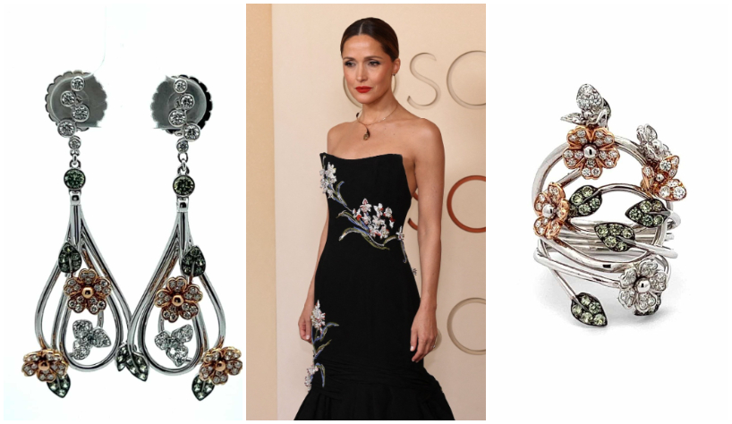 Rose Byrne y Palmiero: Un diseño creado por Dior. Y para ir a tono con los motivos florales del vestido, agregamos un romántico conjunto a cargo de Palmiero en oro blanco de 18K con diamantes y peridotos.
