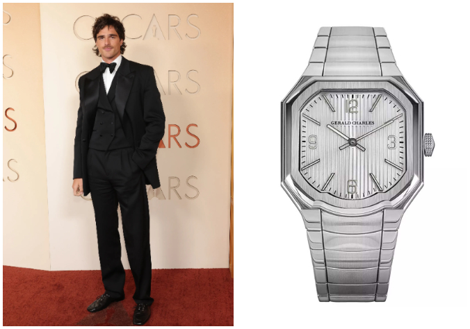 Jacob Elordi y Gerald Charles: A este traje de la marca Bottega Veneta, hemos agregado un reloj de Gerald Charles modelo Masterlink Silver que se integra perfectamente a la elección de moda.