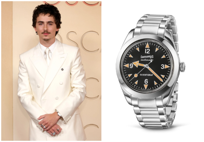 Timothée Chalamet y Eberhard & Co.: La elegante creación de Givenchy en cuando a moda la hemos combinado con el modelo Scientigraf Automatico de la marca suiza.