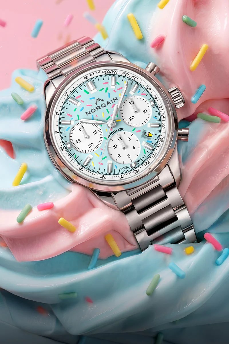 De los modelos develados hasta el momento, indiscutiblemente hay que mencionar al reloj más dulce de la edición. Nos referimos al guardatiempo Freedom Chrono “Sprinkles” a cargo de la firma indenpendiente Norqain. Este reloj nos encanta por su bello colorido y los materiales presentes en su estructura. Un modelo 40mm creado en acerco inoxidable, con encantadora esfera en dos presentaciones: Fresa y Frambuesa Azul. Cada reloj se encuentra adornado con chispas dulces.
