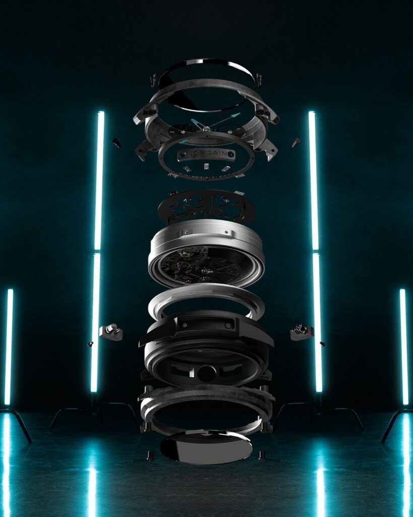 También de Norqain es la siguiente innovación: el reloj Wild ONE Skeleton Chrono. Presenta calibre de manufactura NORQAIN 8K. El reloj visto en Watches and Wonders se caracteriza por la presencia de discos transparentes flotantes que sustituyen a las tradicionales agujas de los segundos y los minutos cronógrafo. Este guardatiempo ha sido diseñado por la marca pensando en las exigencias de los atletas.