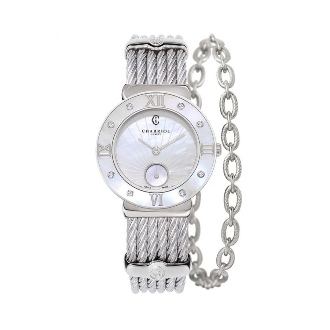 Charriol, reloj dama, 30 mm de caja, quarzo, diamantes, esfera madre perla, acero
