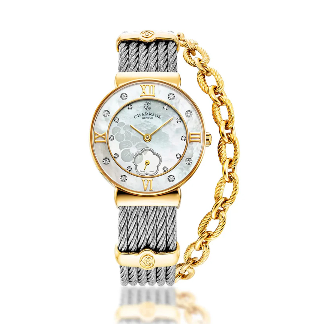 Charriol, reloj dama, 30 mm de caja, quarzo, esfera madre perla, acero PVD ORO Amarillo
